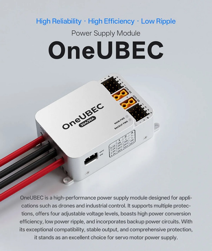 The OneUBEC Power Module supports a 3S to 18S wide-range voltage input, allowing it to operate seamlessly with various lithium battery configurations. This flexibility enables UAV designers and integrators to standardize power management across multiple platforms without redesigning the power subsystem.