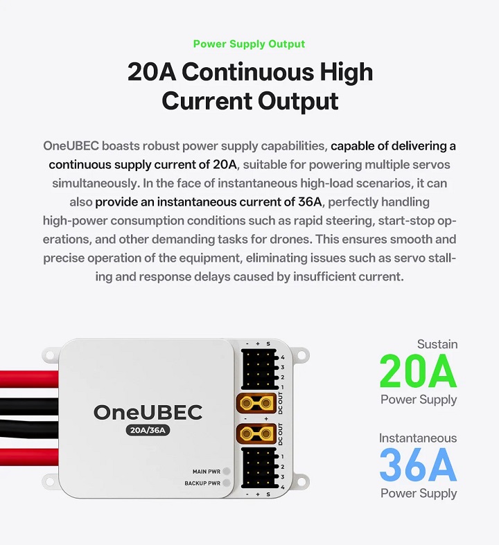 This power module delivers 20A continuous supply current, with instantaneous peak current up to 36A. Such capacity ensures reliable operation even when multiple subsystems draw power simultaneously, such as during payload activation or rapid throttle changes.