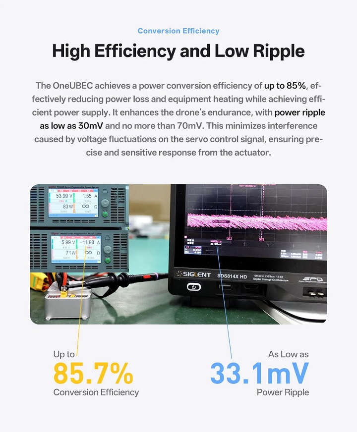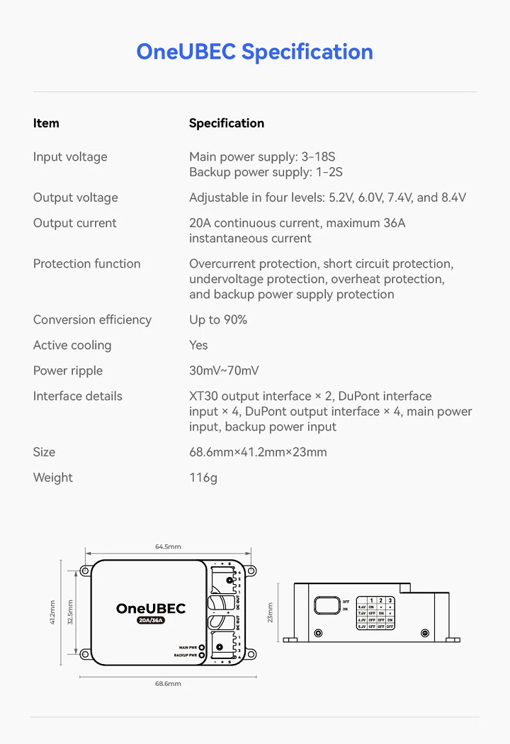 To accommodate different onboard electronics, the OneUBEC Power Module provides four-level adjustable output voltage from 5.2V to 8.4V. This allows engineers to fine-tune power output according to the requirements of avionics, communication modules, or navigation systems.