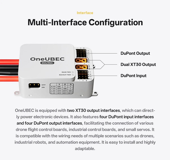 The OneUBEC Power Module supports both XT30 and DuPont connectors, offering compatibility with common UAV wiring standards. This dual-connector design allows integrators to connect directly to power distribution boards or route regulated power to auxiliary devices with minimal modification.