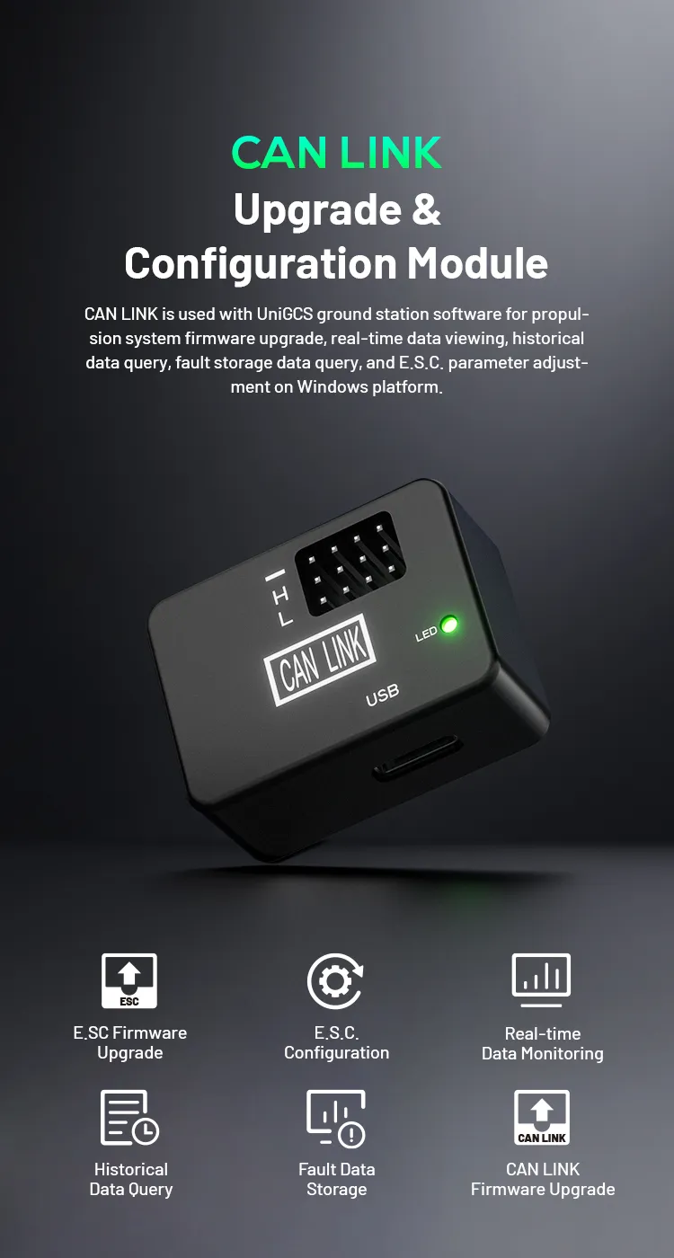 SIYI CAN LINK Module is used with UniGCS ground station software for propulsion system firmware upgrade, real-time data viewing, historical data query, fault storage data query, and E.S.C. parameter adjustment on Windows platform.
