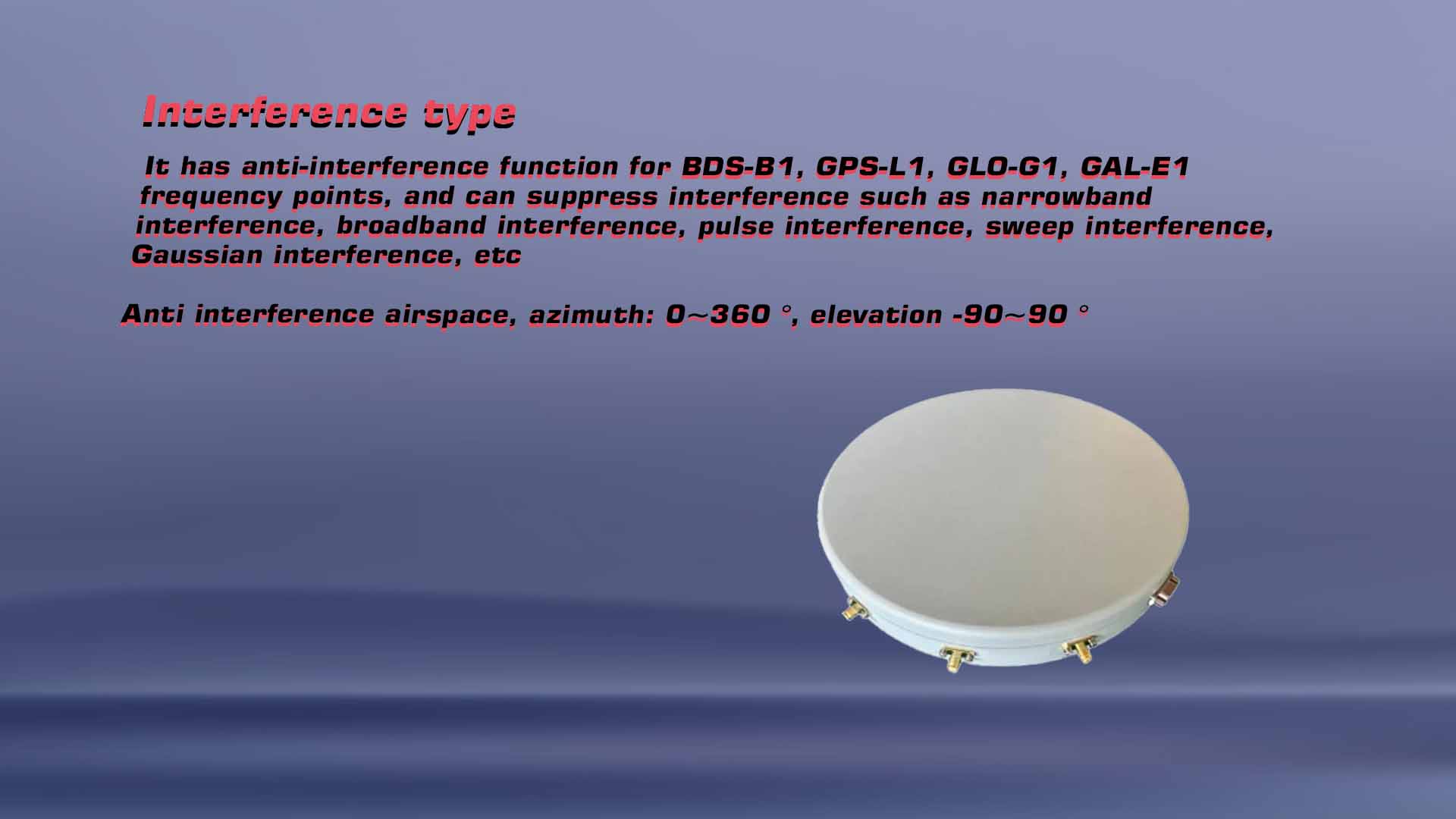 It has anti-interference function for BDS-B1, GPS-L1, GLO-G1, GAL-E1 frequency points, and can suppress suppression interference such as narrowband interference, broadband interference, pulse interference, sweep interference, Gaussian interference, etc |