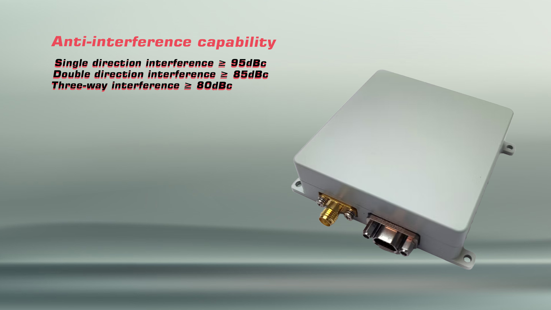 | Anti-interference Capability | Single direction interference ≥ 95dBc Double direction interference ≥ 85dBc Three-way interference ≥ 80dBc ≥10W anti-continuous wave |