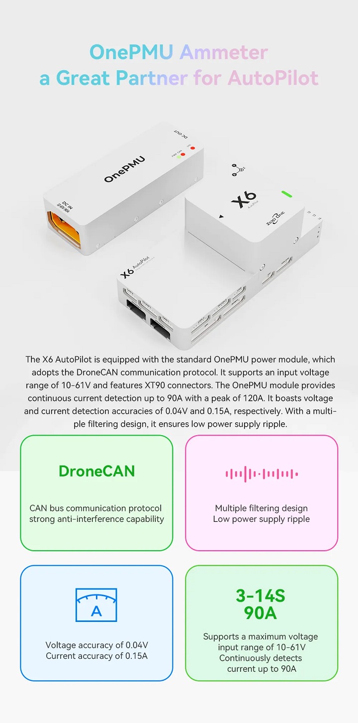 Yes. ZeroOne OnePMU is designed as a DroneCAN power module with a wide 3S to 14S input range, and it provides high-accuracy voltage and current telemetry that supports reliable battery monitoring on compatible autopilots.