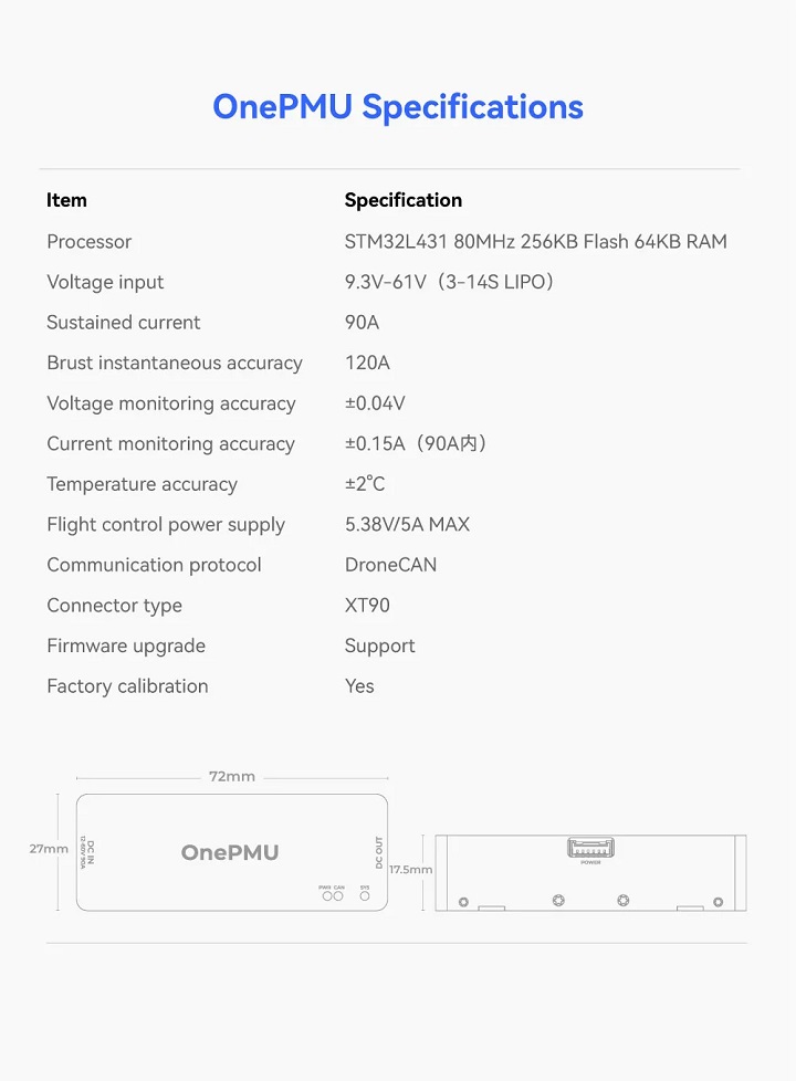ZeroOne OnePMU supports a broad 3S to 14S voltage input range, making it suitable for many industrial multirotor and VTOL power trains. The input uses an XT90 connector, which is commonly selected for higher-current battery connections and quick field swaps.