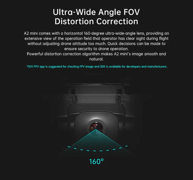 With a massive 160° lens, the SIYI A2 Mini lets you capture sweeping panoramas and immersive first-person view experiences. You’ll see more in every shot — ideal for landscape flying, architectural shots, or dynamic cinematic sequences where surroundings add depth and character.
