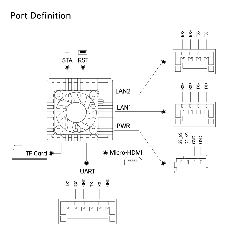 | Interfaces | 2x Ethernet, 1x Power, 1x Micro-HDMI, 1x UART, 1x TF Card |