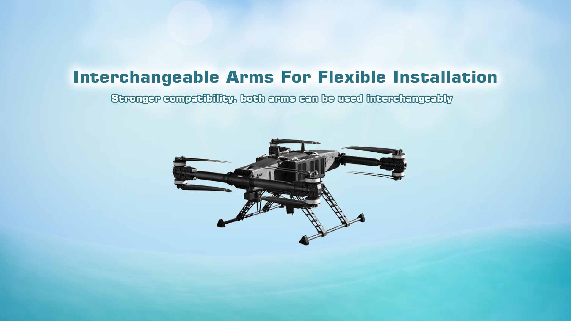 The frame features a lightweight carbon-fiber construction for high strength-to-weight performance, supports long electric power systems, and accommodates custom payload integrations. It offers optimized arm spacing for flight stability under heavy loads.