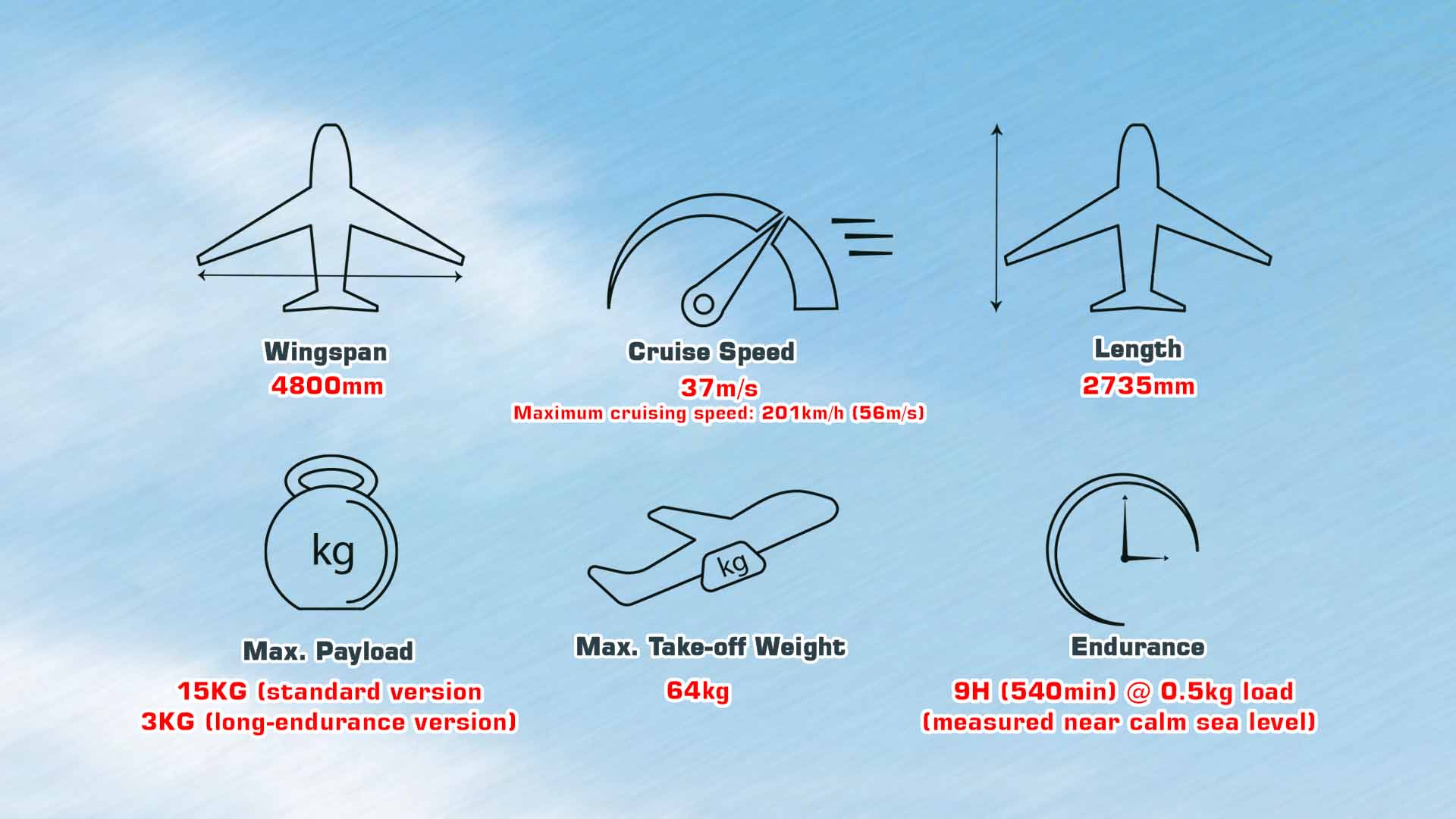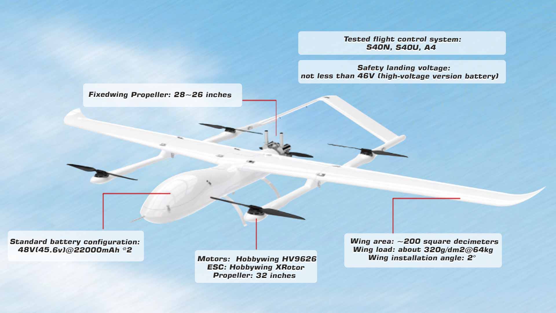 The MH48 is a hybrid VTOL fixed-wing UAV combining quadrotor lift with a fixed-wing cruise configuration. It has a fuselage length of 2.74 meters, wingspan of 4.8 meters, and a maximum takeoff weight of 64 kilograms. The drone supports a maximum payload of 15 kilograms (or up to 34 kilograms excluding fuel and batteries). It achieves an endurance of up to 9 hours (540 minutes) with a light payload and maintains a cruise speed of 37 meters per second. The MH48 can fly up to 4,800 meters altitude and withstand level 4 winds, with gust resistance up to level 6.