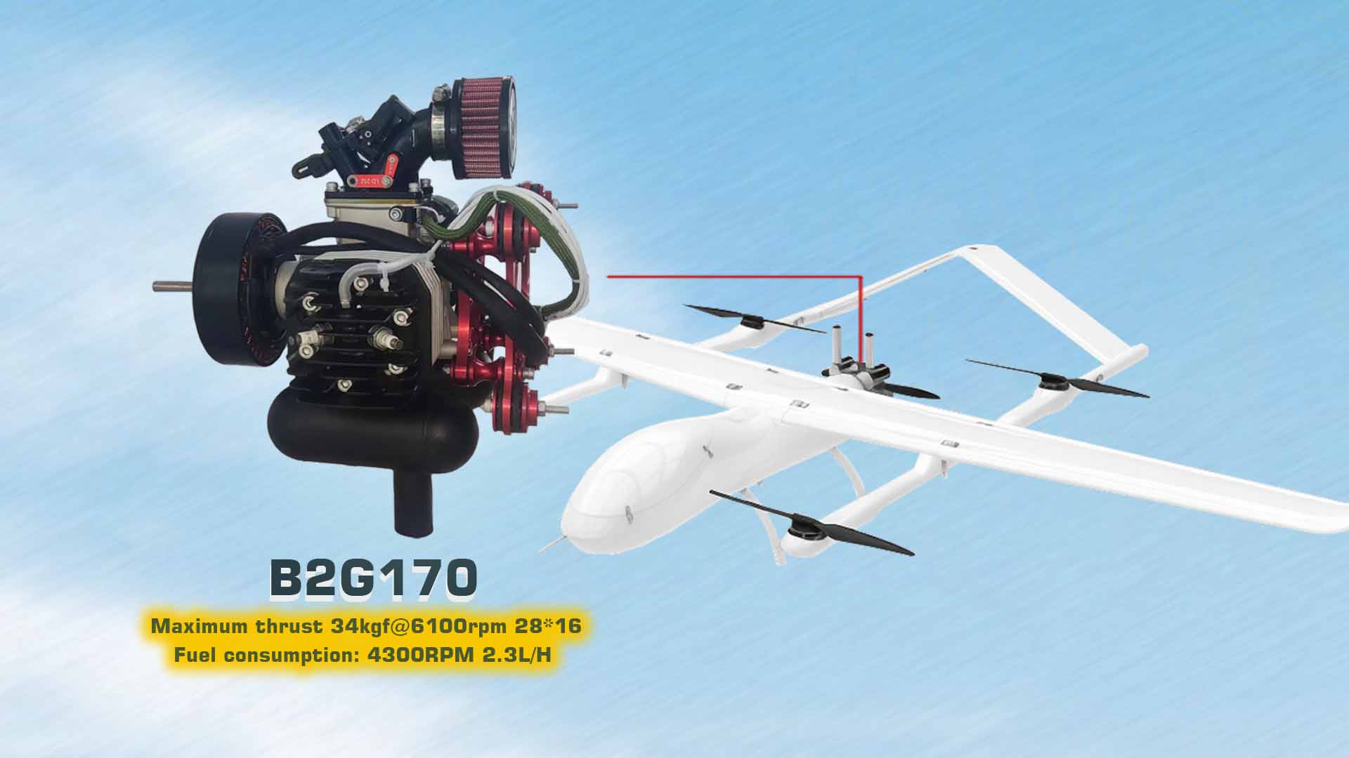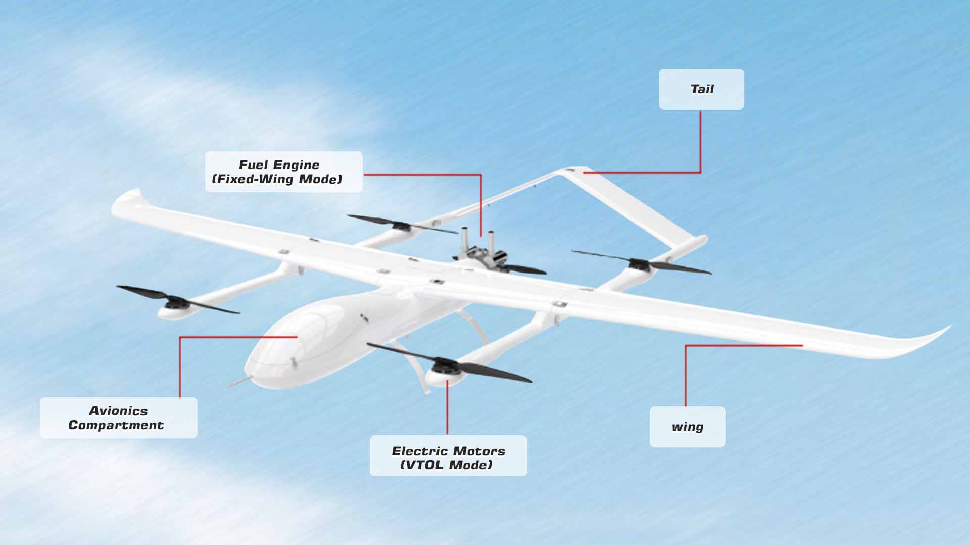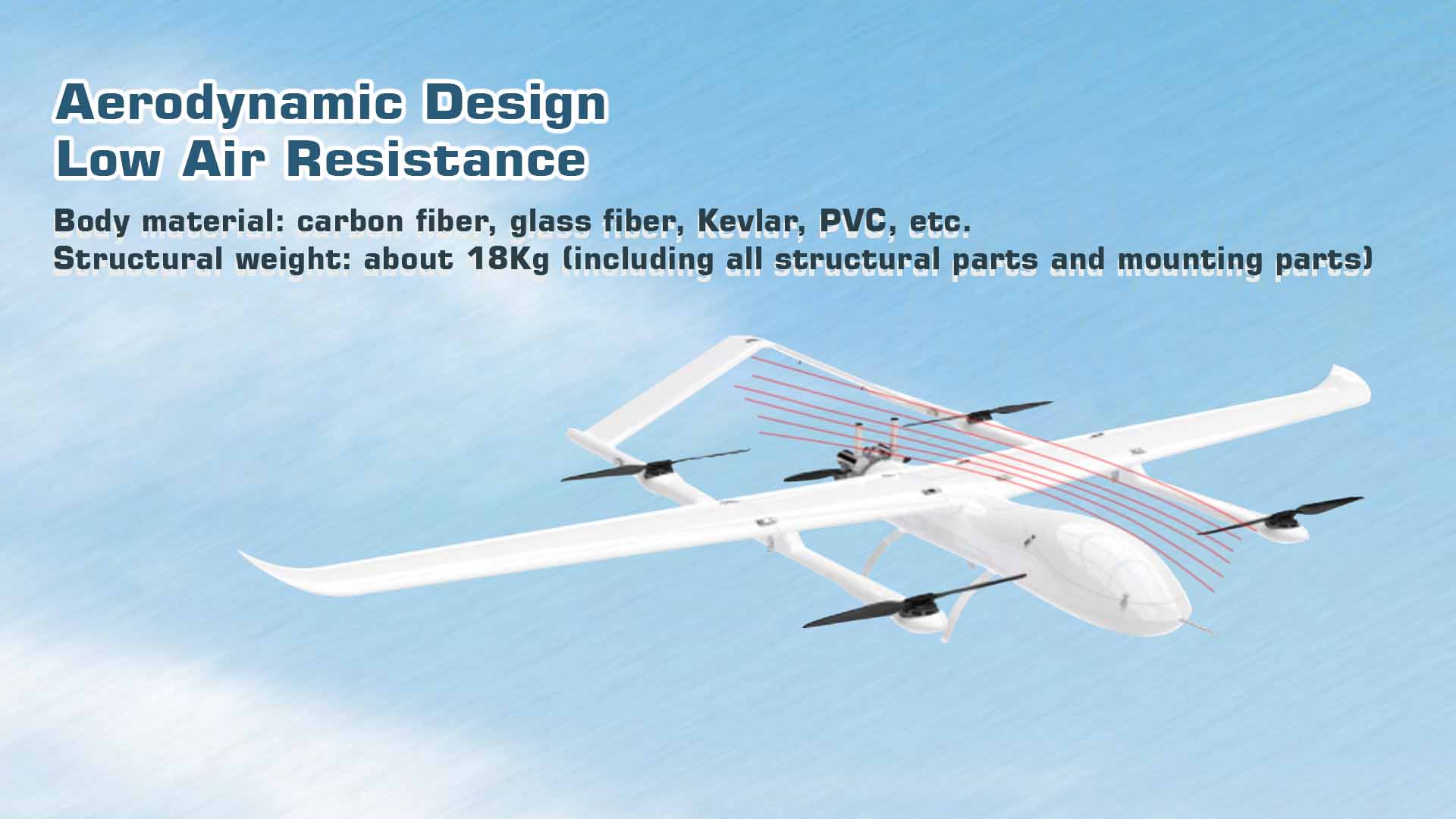 The airframe is built from carbon fiber, glass fiber, Kevlar, and PVC composites, offering high strength and low weight. The drone employs a hybrid power system combining a gasoline engine for cruise with electric rotors for vertical takeoff and landing. This configuration enables long-endurance missions and reliable performance in diverse environments.